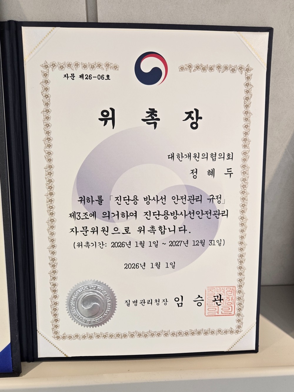 진단용 방사선 안전관리 자문위원으로 위촉되었습니다.