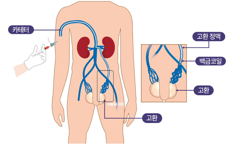 대퇴부 또는 오른쪽팔의 정맥을 통하여 역류를 일으키는 고환정맥에 가느다란 의료용 도관을 삽입한 후 백금코일과 경화제를 이용하여 혈관을 막아 역류를 차단하는 시술입니다.