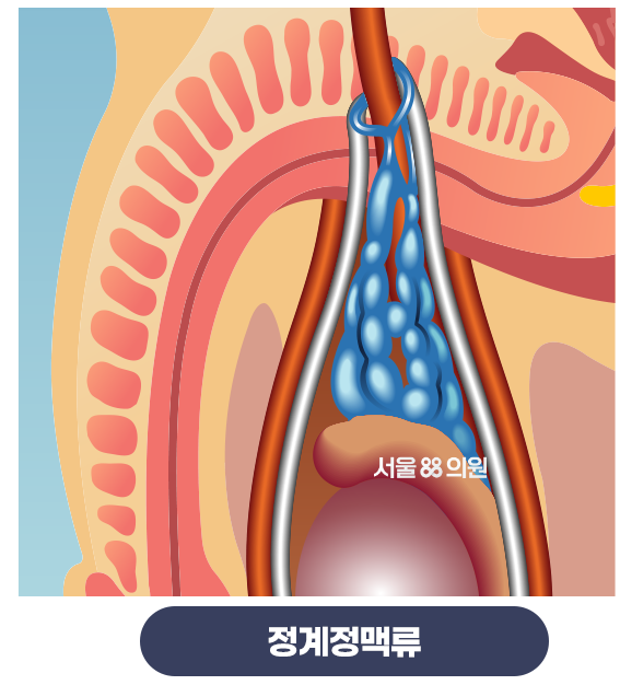 정계정맥류는 고환에서 나가는 피가 모이는 망상정맥총이 구불구불하게 확장되어 발생하는 질환입니다.