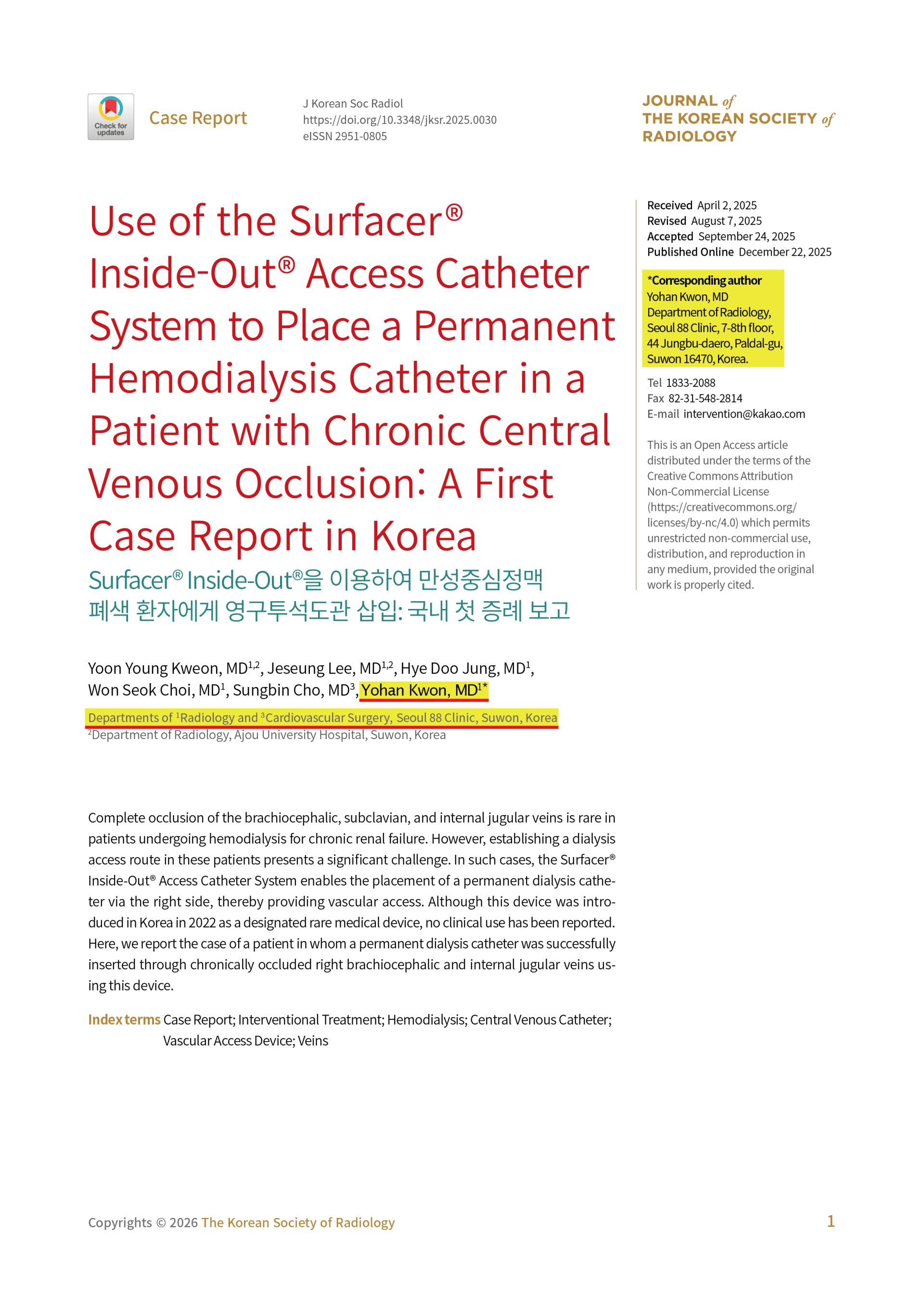 등재된 논문의 제목은 "Use of the Surfacer® Inside-Out® Access Catheter System to Place a Permanent Hemodialysis Catheter in a Patient with Chronic Central Venous Occlusion: A First Case Report in Korea"로 Surfacer기기를 이용하여 만성중심정맥 폐색 환자에게 영구투석도관을 삽입한 국내 첫 증례 보고입니다.