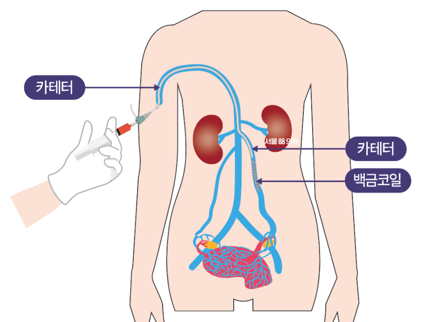 역류를 일으키는 혈관에 가느다란 의료용 도관을 삽입한 후 백금코일과 경화제를 이용하여 혈관을 막아 역류를 차단하는 시술입니다.